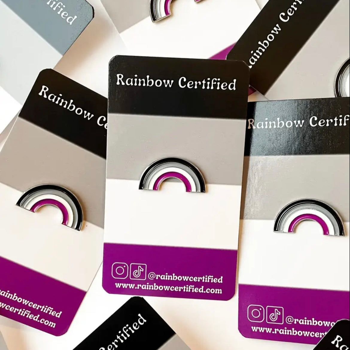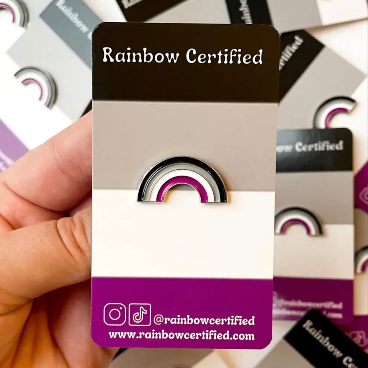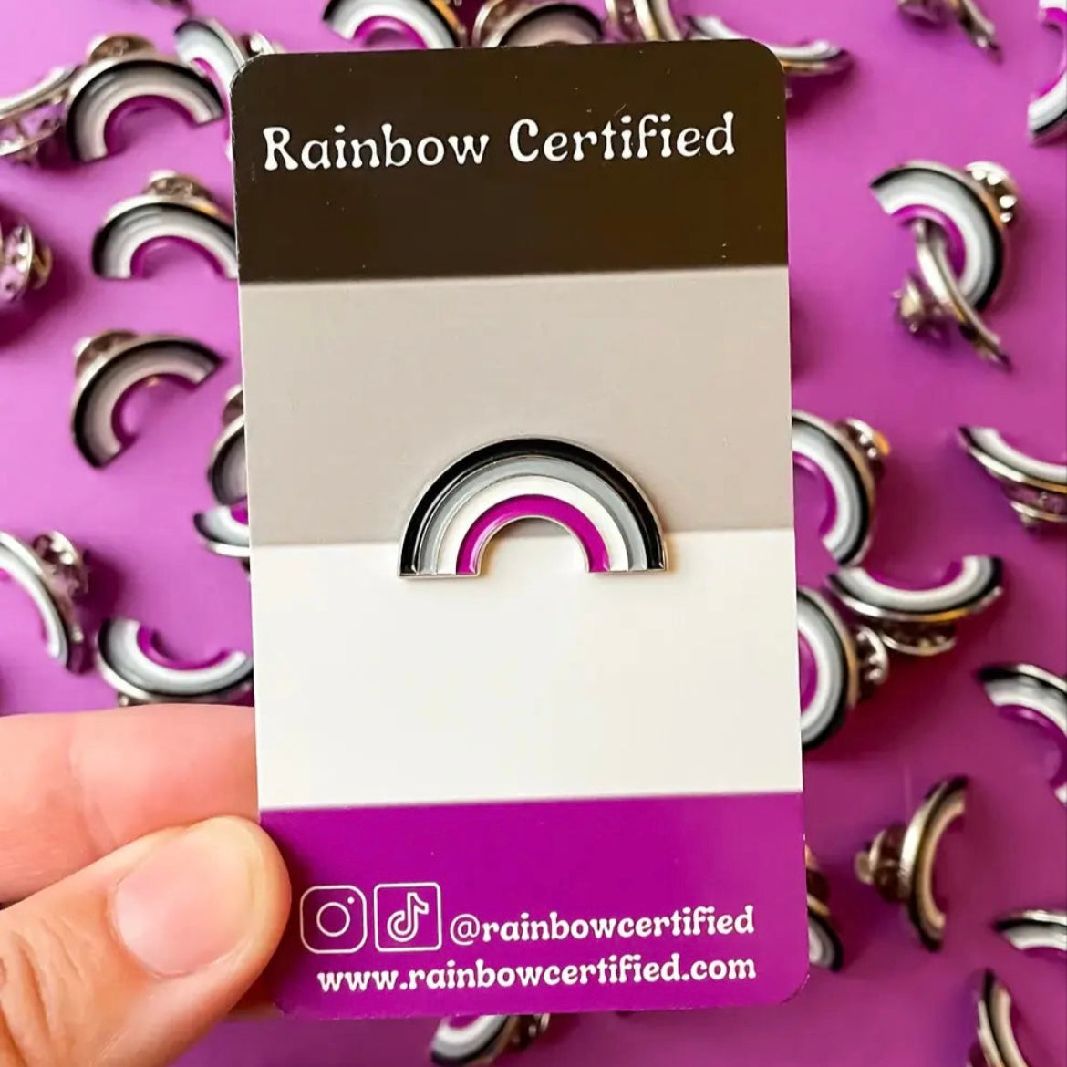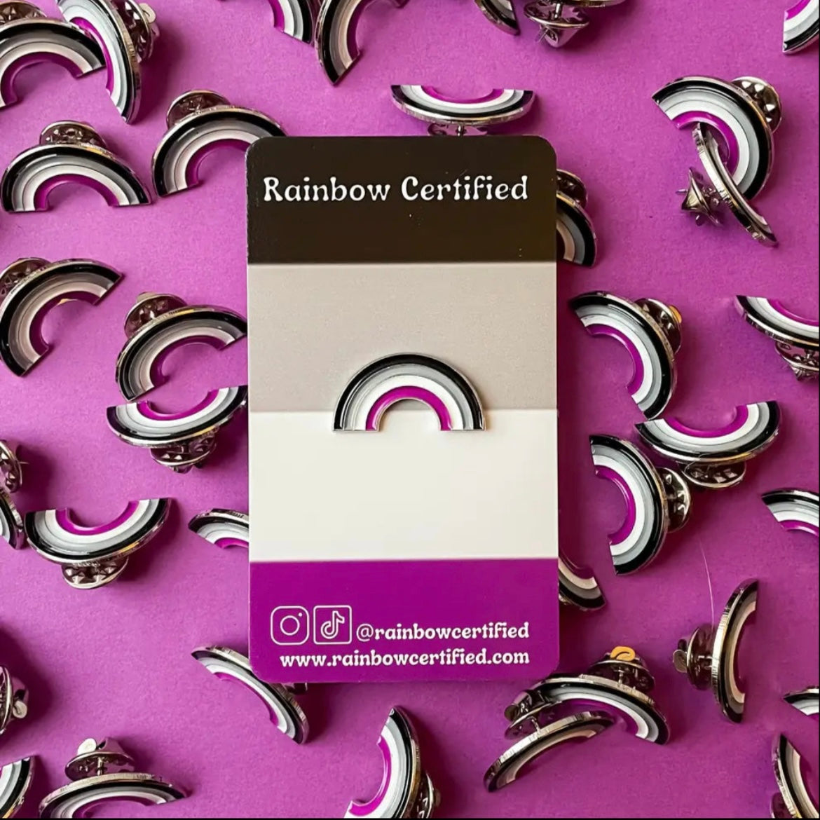 Showing off the Asexual PRIDE Flag In this cute rainbow enamel pin. Each pin is 2.5cm