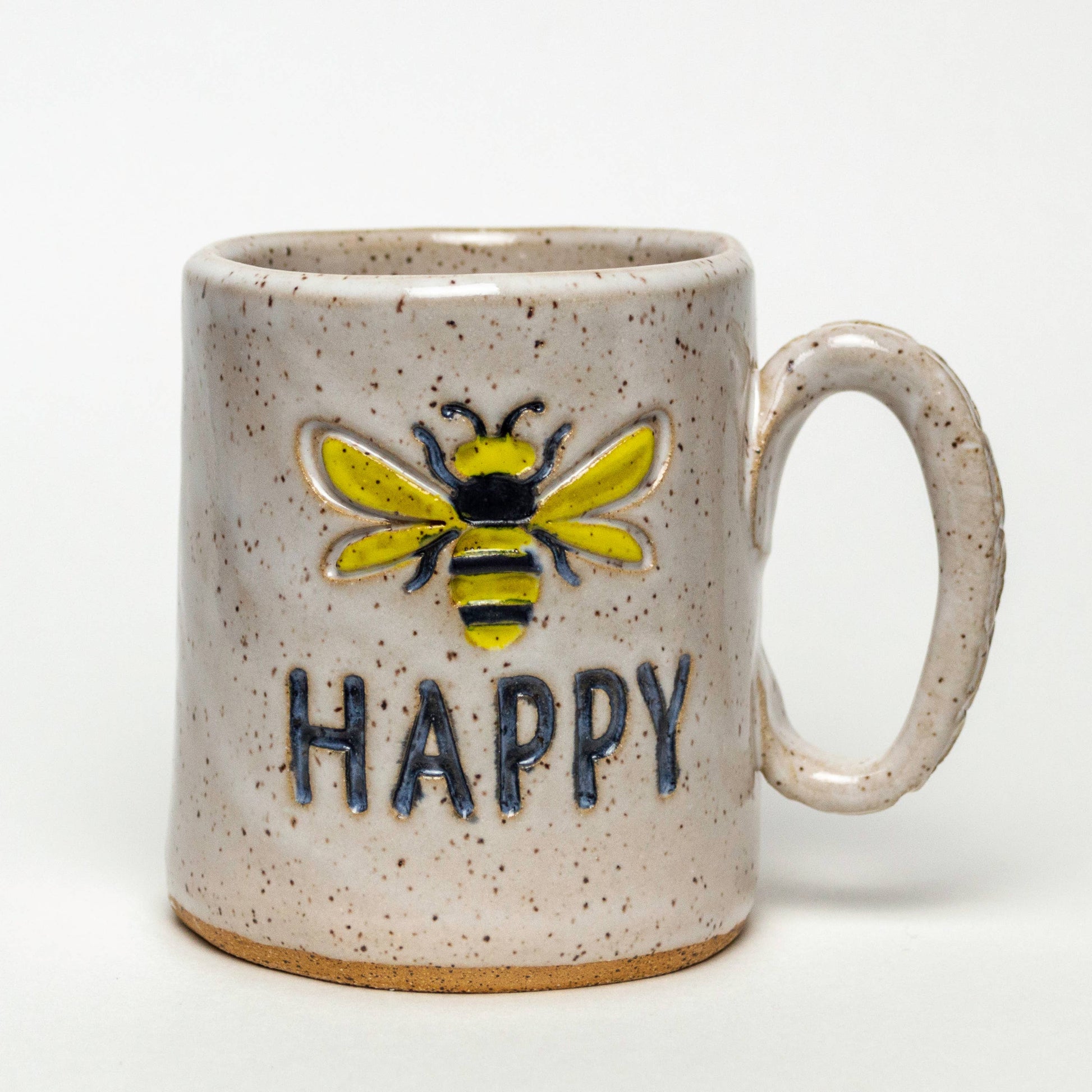This beautiful stoneware ceramic bee happy pattern mug, approximately 12 oz., Is hand-built and hand-glazed in Ohio, USA. Food, dishwasher, and microwave safe. It measures approximately 4 inches long by 3 1/4 inches wide and 4 inches high. All our ceramic items are handmade by jack or Kim and will vary from one to the next. No 2 pieces will be exactly the same. Colors may vary slightly.