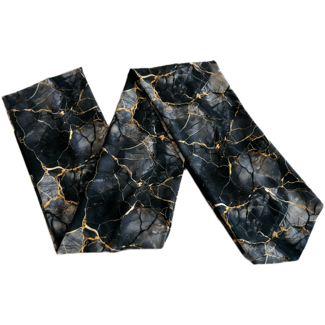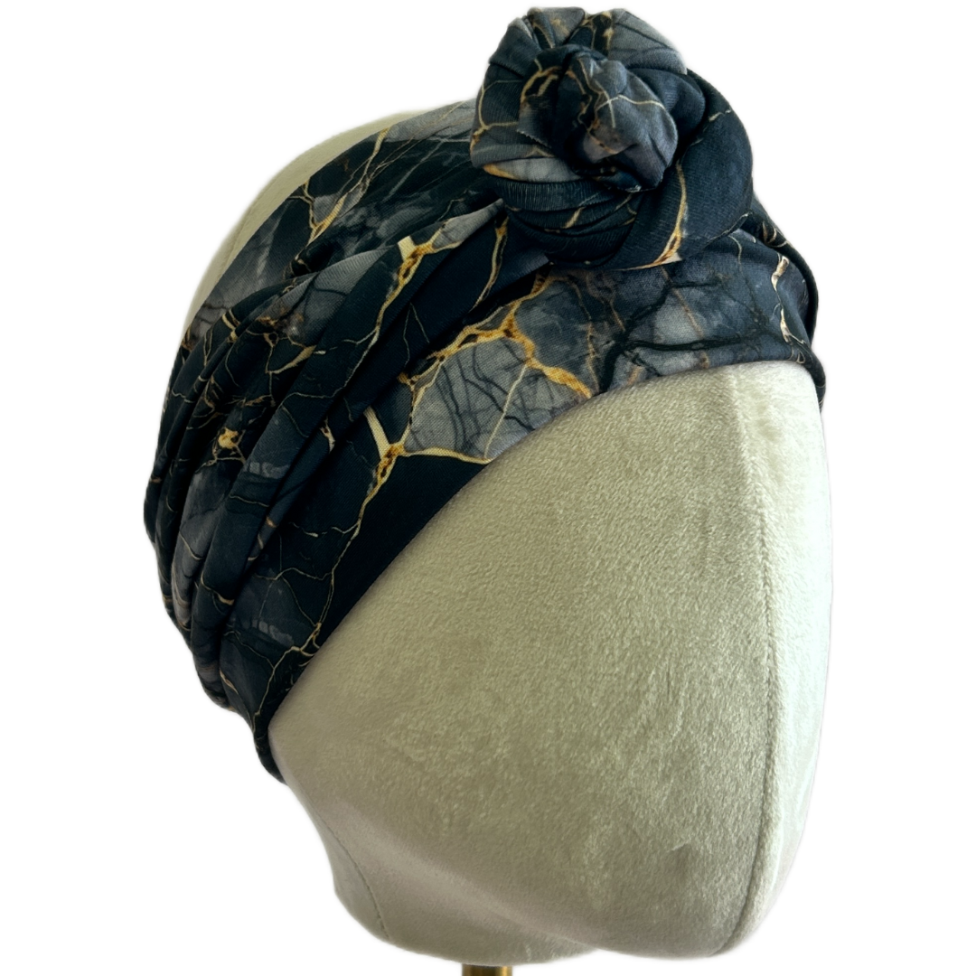 Make a statement with our Black Marble wrap headband, featuring dramatic gold veining over an inky marble base. Designed for secure comfort and high style.