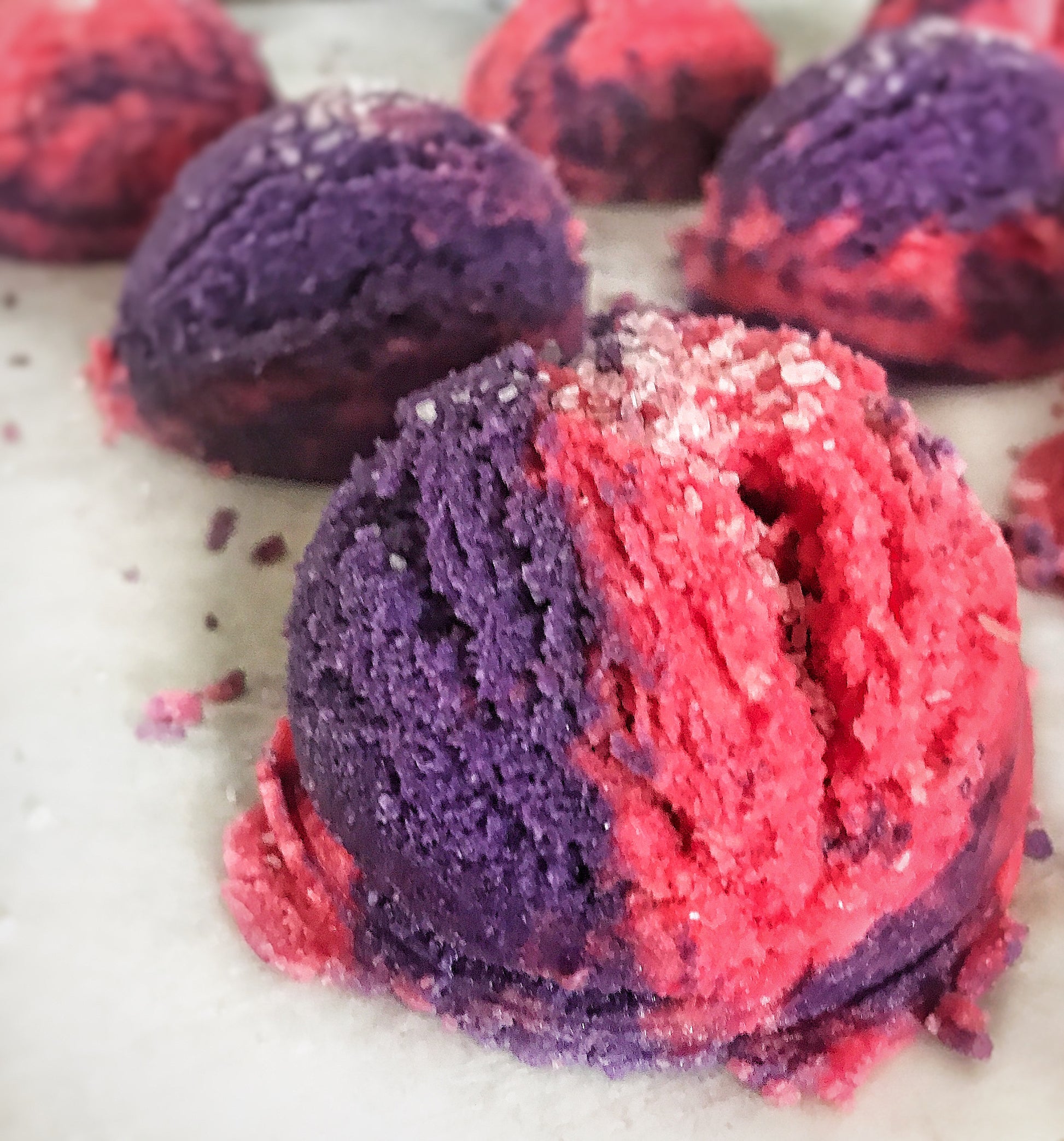 Ingredients: Sodium Bicarbonate (Baking Soda), Citric Acid, Sodium Lauryl Sulfoacetate (SLSA), Cream of Tartar, Shea Butter, Cocoa Butter, Liquid Glycerin, Polysorbate-80, Essential Oils, Micas