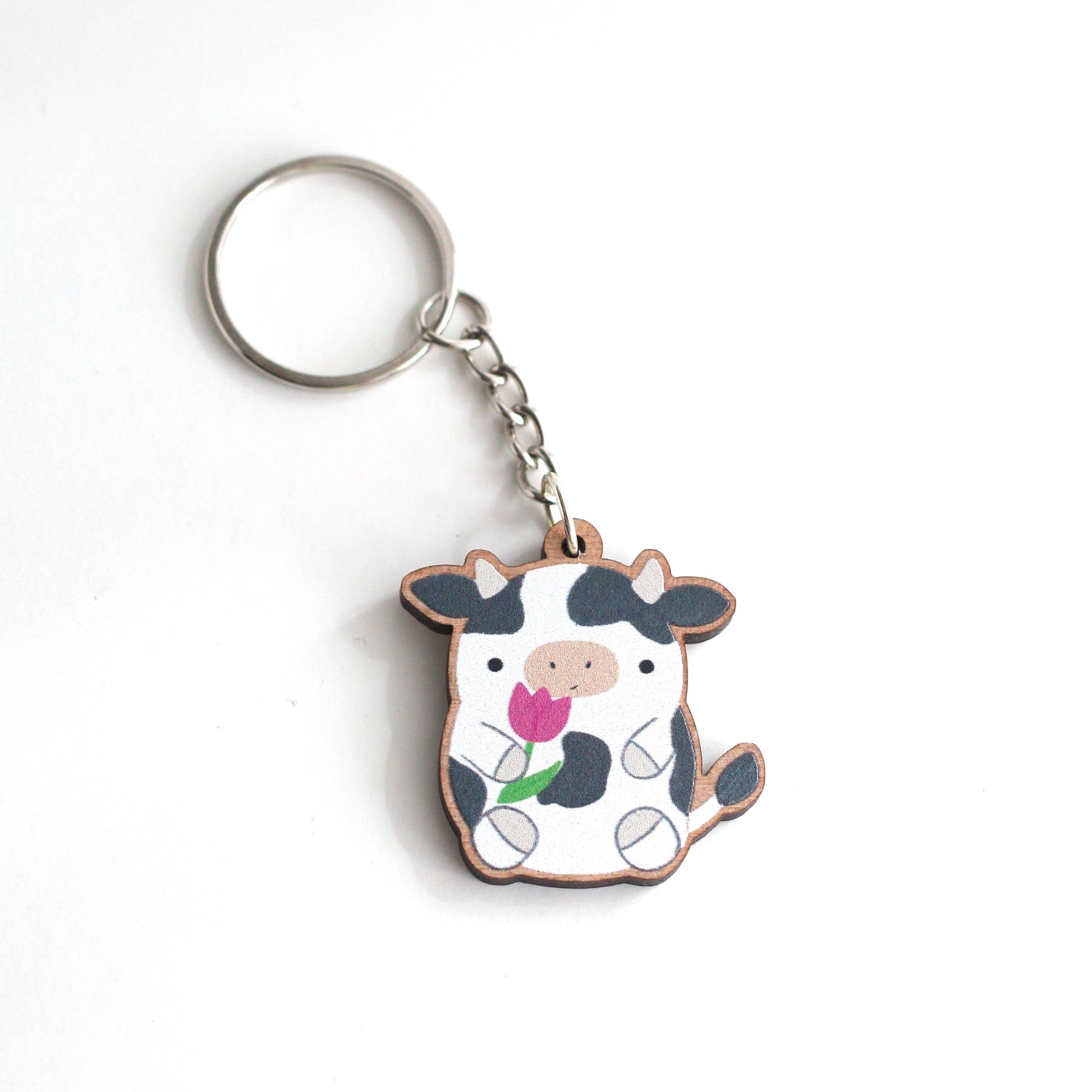 Cow holding a Tulip Wooden Keychain. Cute Cow Wood Charm