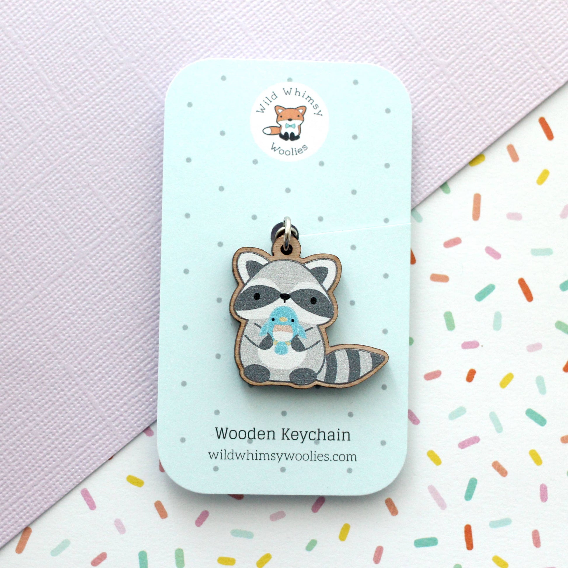 Cute Raccoon Keychain. Wood Animal Keychain. Bird Keychain