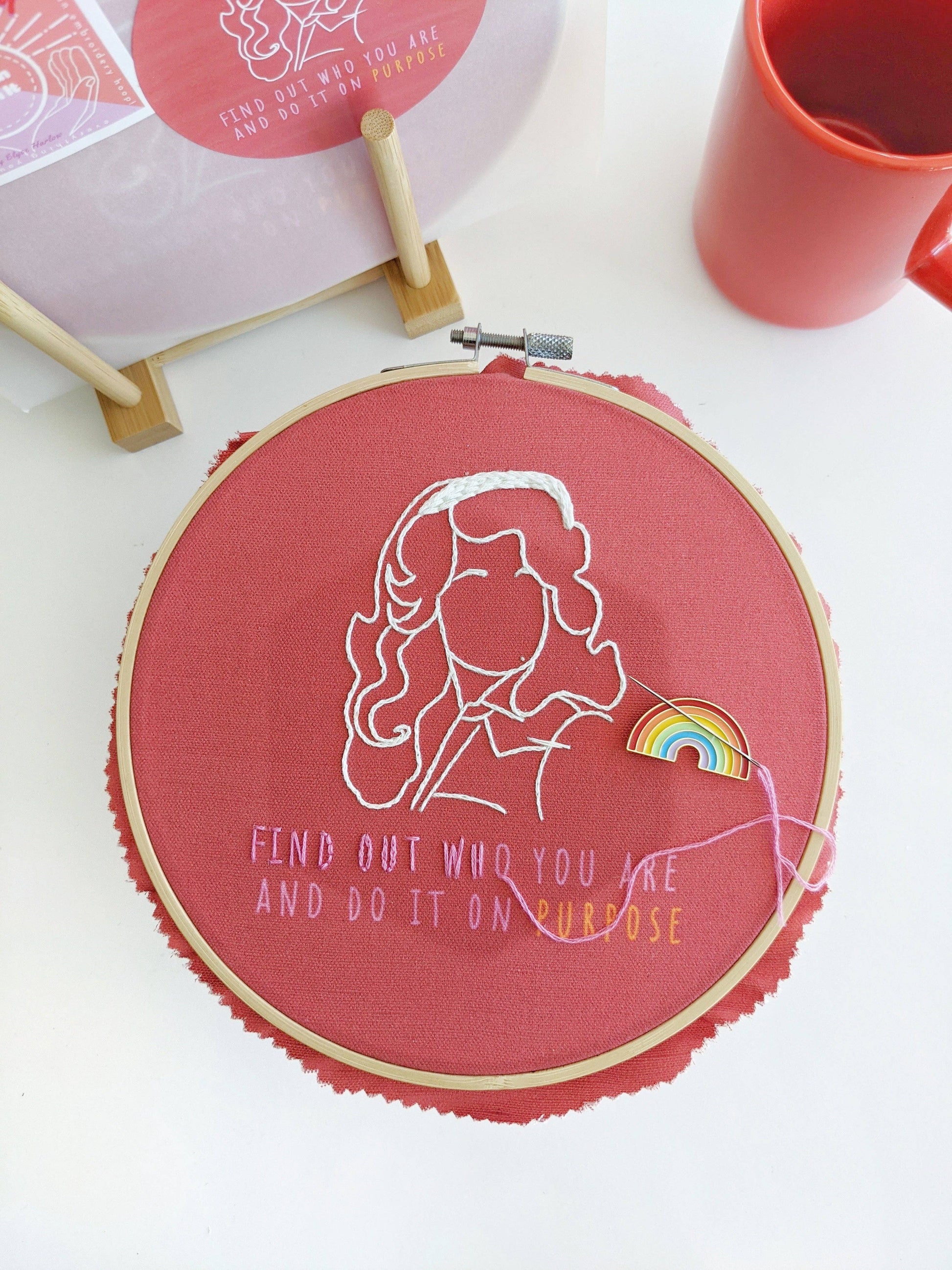 -’Dolly Parton’ Kit comes with a 7 inch wooden/bamboo hoop, 2 needles, pre-printed pattern, thread and thread guide!