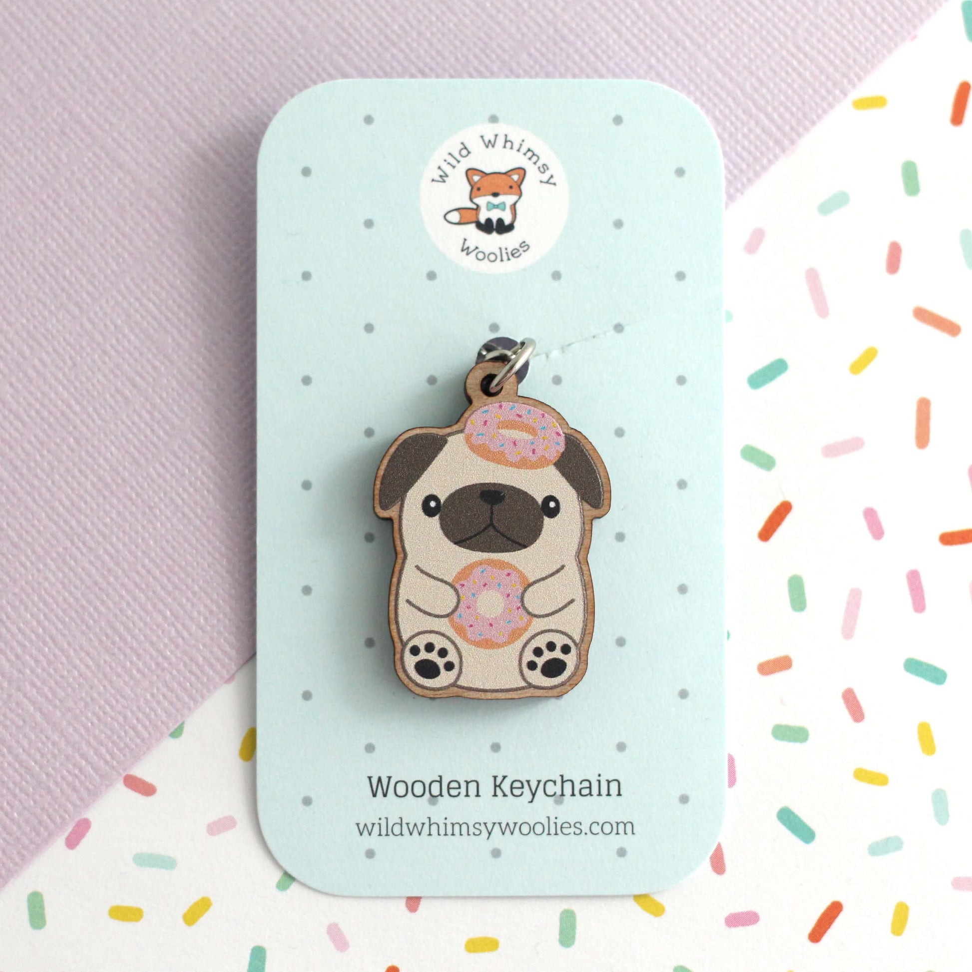 Donut Loving Pug Wooden Keychain. Cute Dog Purse Charm