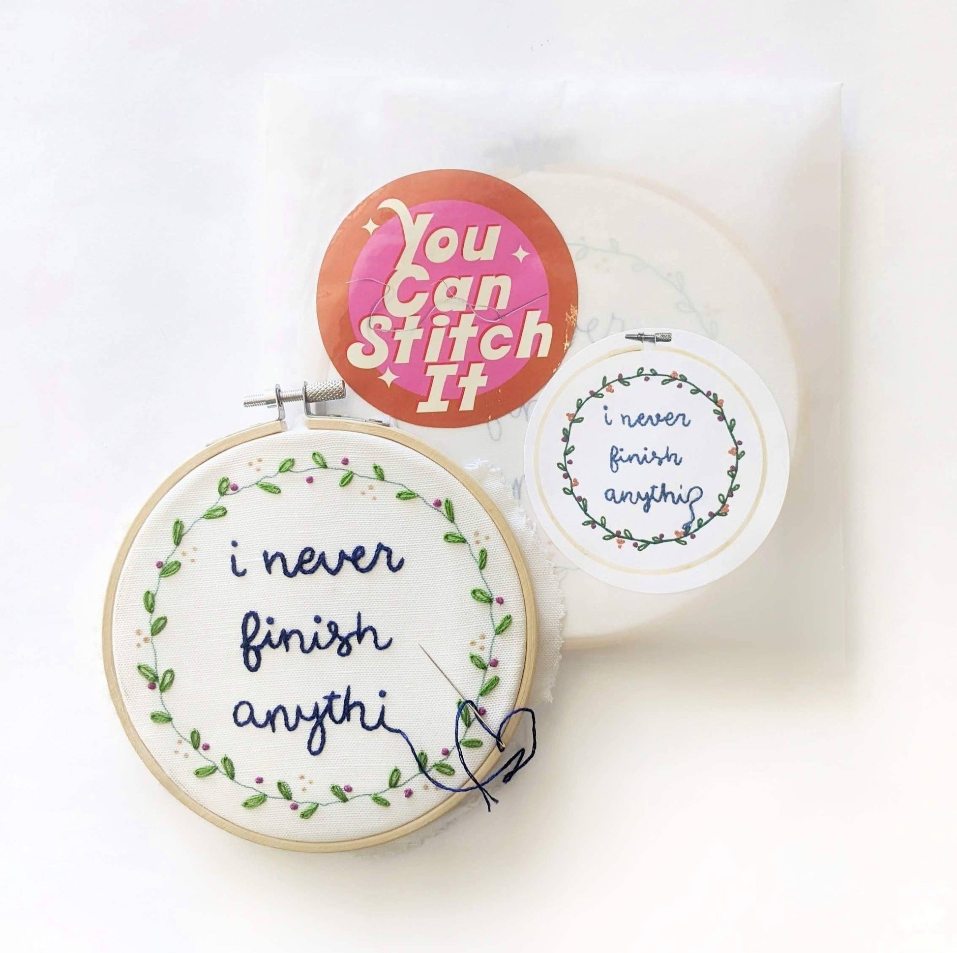’I never finish anythi’ kit comes with a 6 inch wooden/bamboo hoop, you will also find 2 needles and a thread count suggestion card. Thread colors shown are what comes with the kit. If you would like to change up the colors, send me a message!