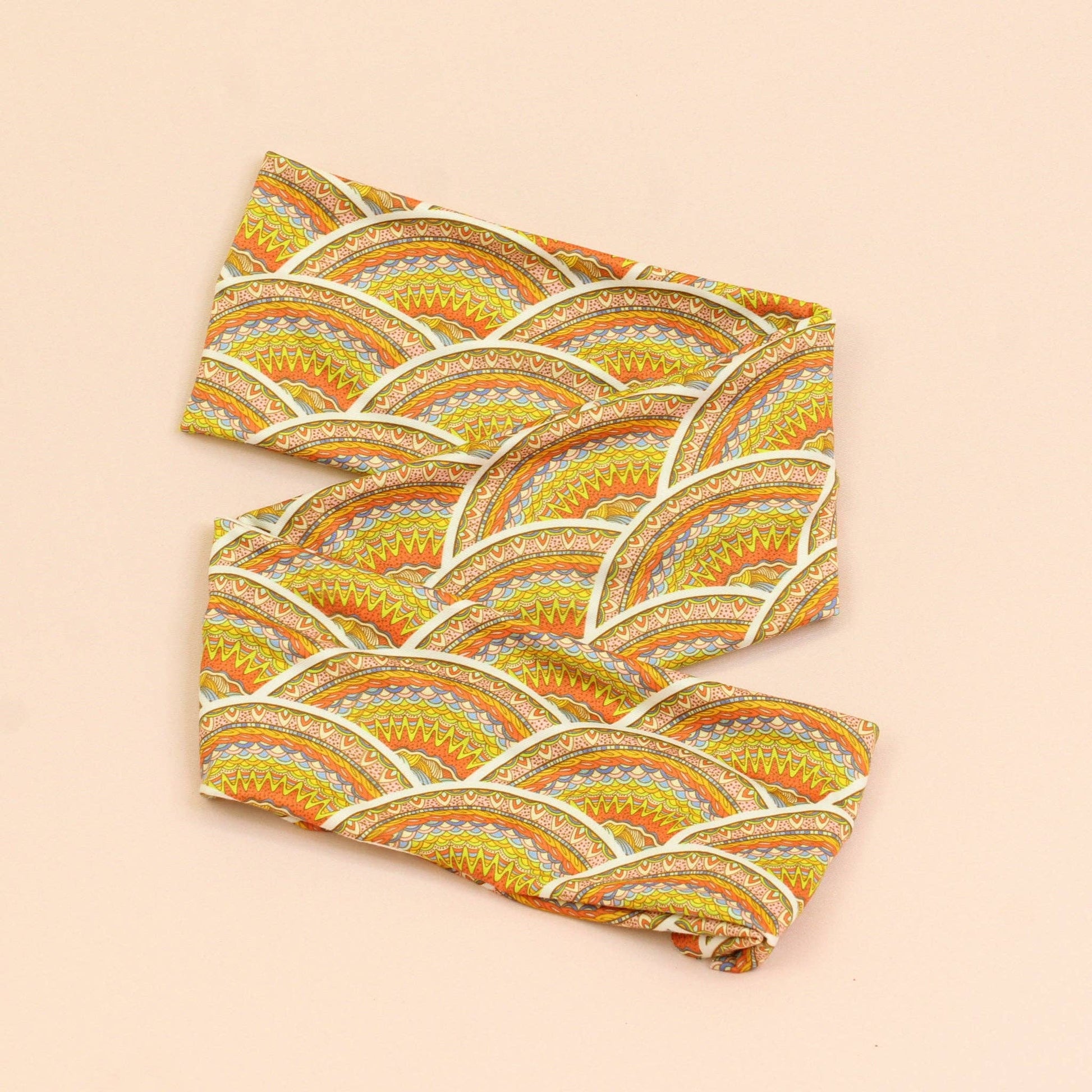 This headband features a yellow and orange bohemian pattern.