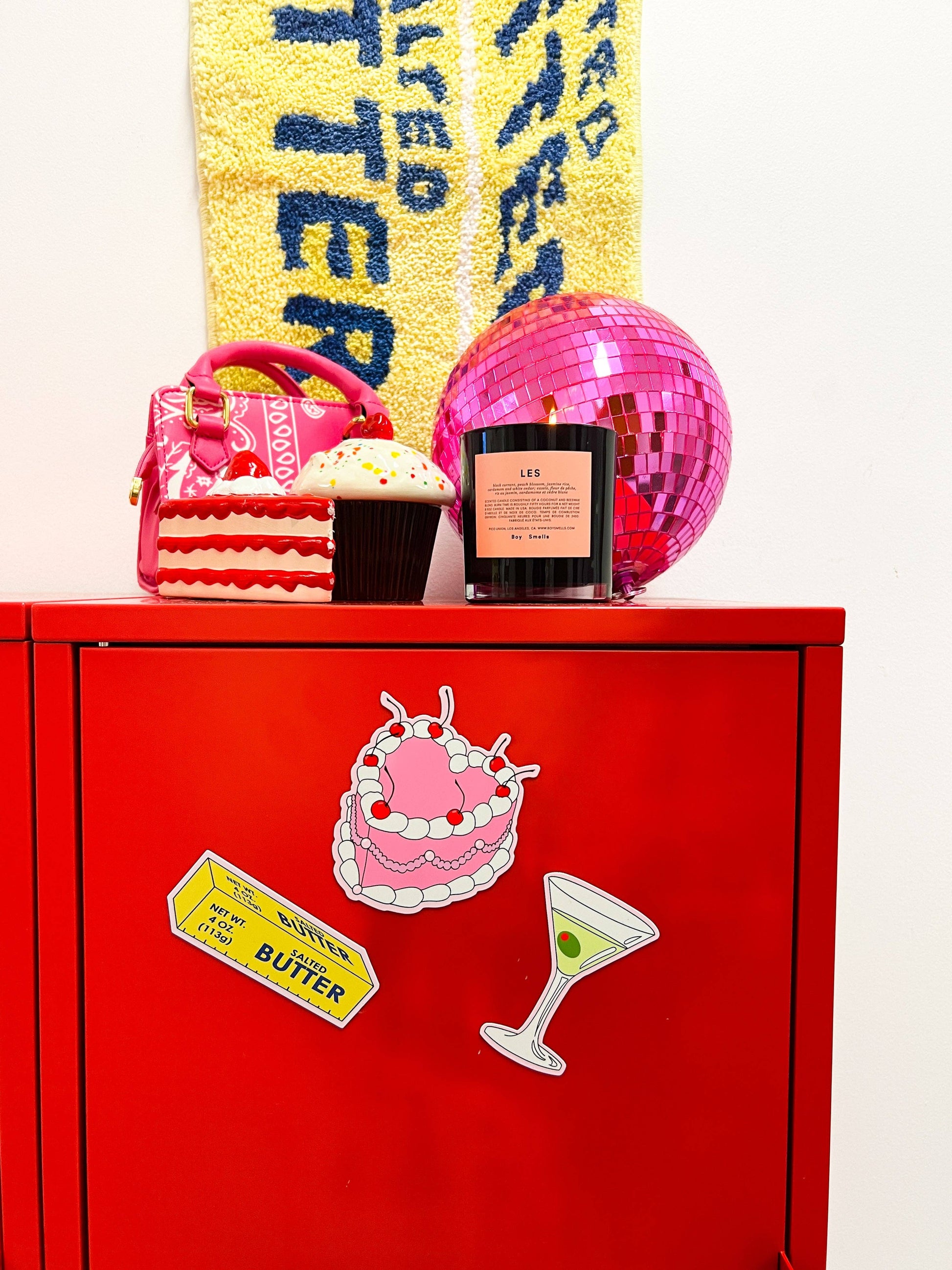 This set includes 3 magnets, a cake, a stick of butter and a martini. The 3 food groups!