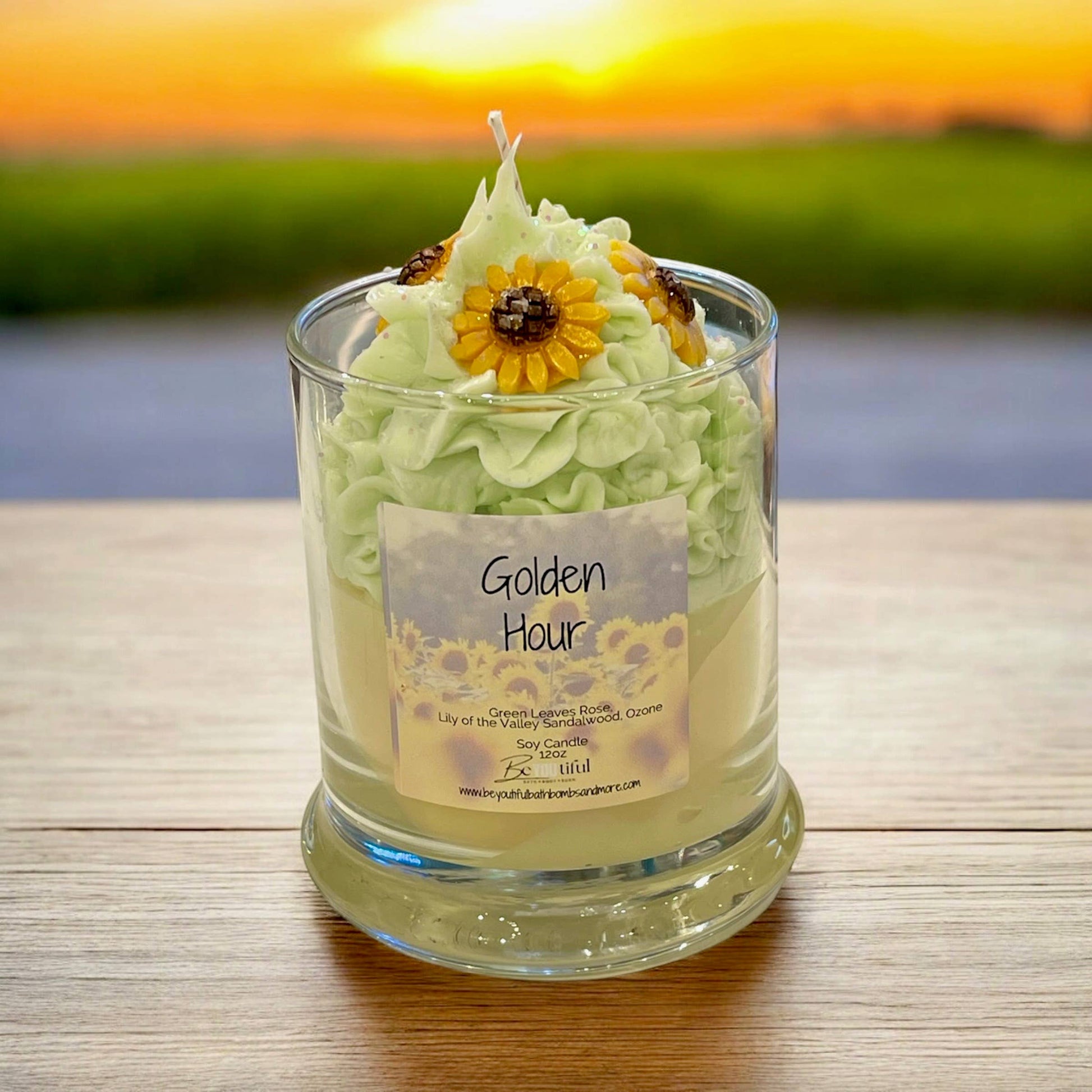 Bring the essence of a sunlit garden after a refreshing rain with our Golden Hour dessert candle. This unique fragrance blends the crisp, earthy notes of fresh rain with the smooth, sophisticated scent of chardonnay, creating a serene yet uplifting atmosphere. The sunflower-shaped design adds a touch of nature’s beauty, making it a perfect addition to any room.