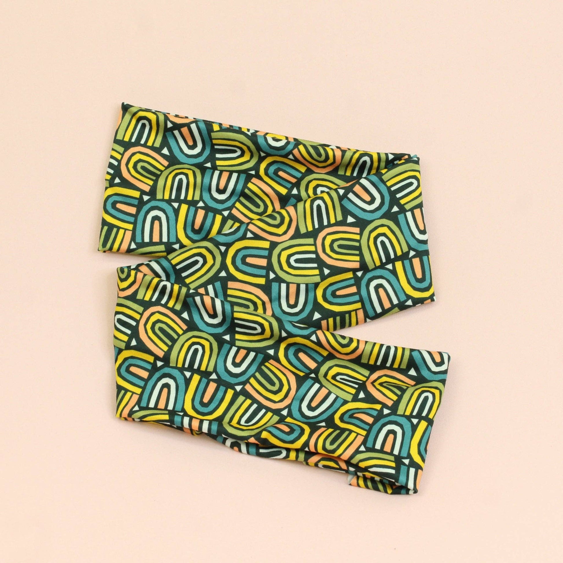 This headband features a green and yellow bohemian pattern.