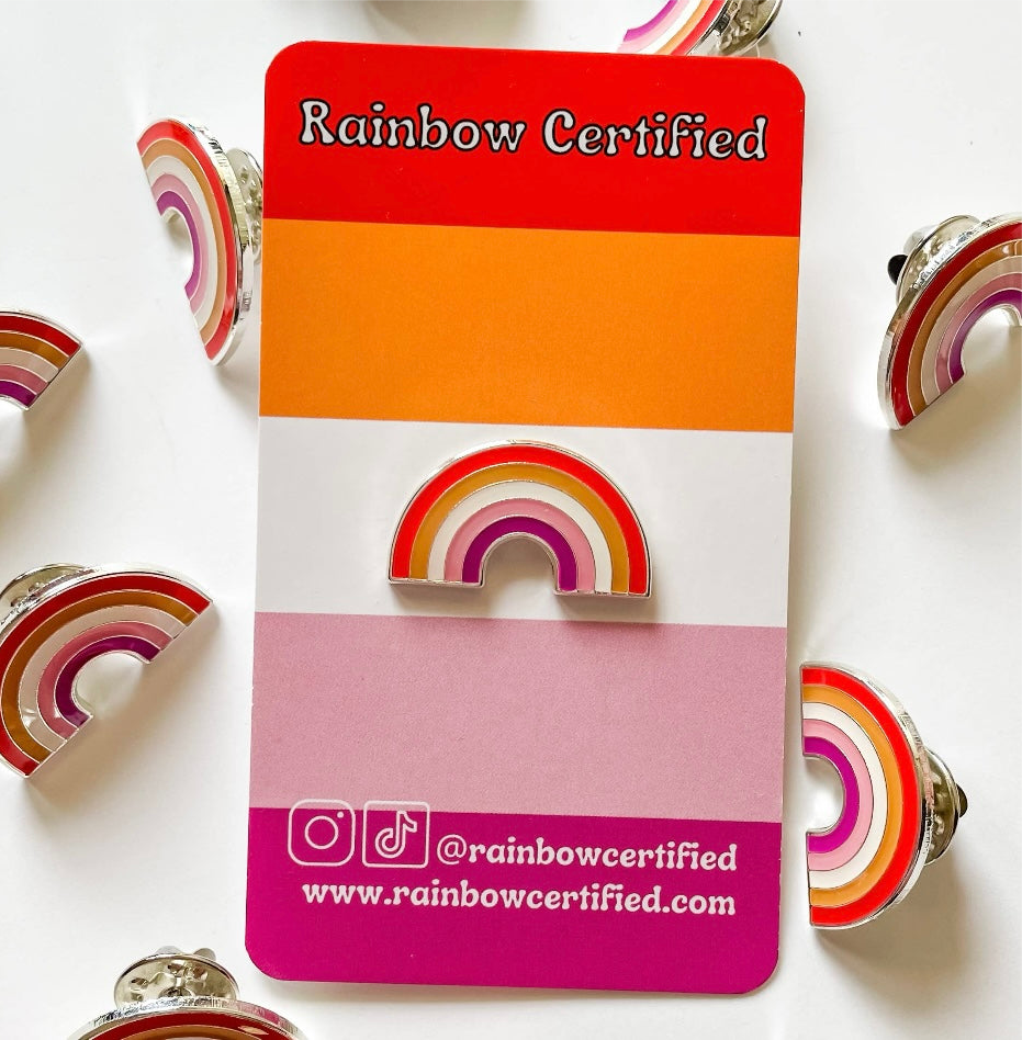 The lesbian pride flag in a cute rainbow enamel pin! Each pin is 2.5cm and comes with butterfly backing. Each pin is secured to a backing card as shown in photo.