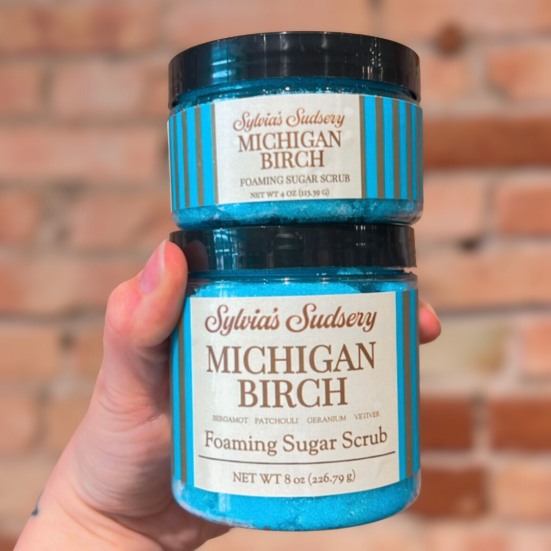Capture the essence of a Michigan birch tree with the calming scents of bergamot, geranium, and base notes of vetiver and patchouli. This foaming sugar scrub evokes the fresh, invigorating aroma of birch trees swaying gently in the breeze.