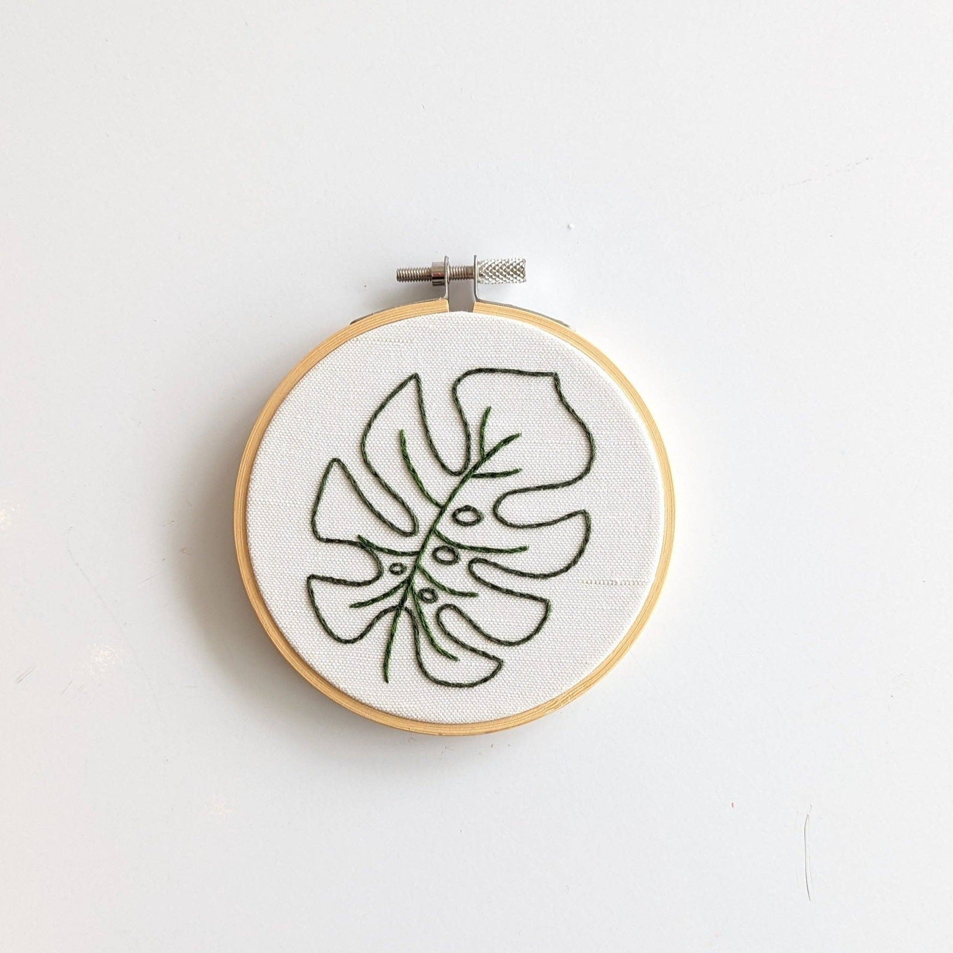 - Monstera Leaf Kit comes with a 4 inch wooden/bamboo hoop, 2 needles, pre-printed pattern, thread and thread guide!