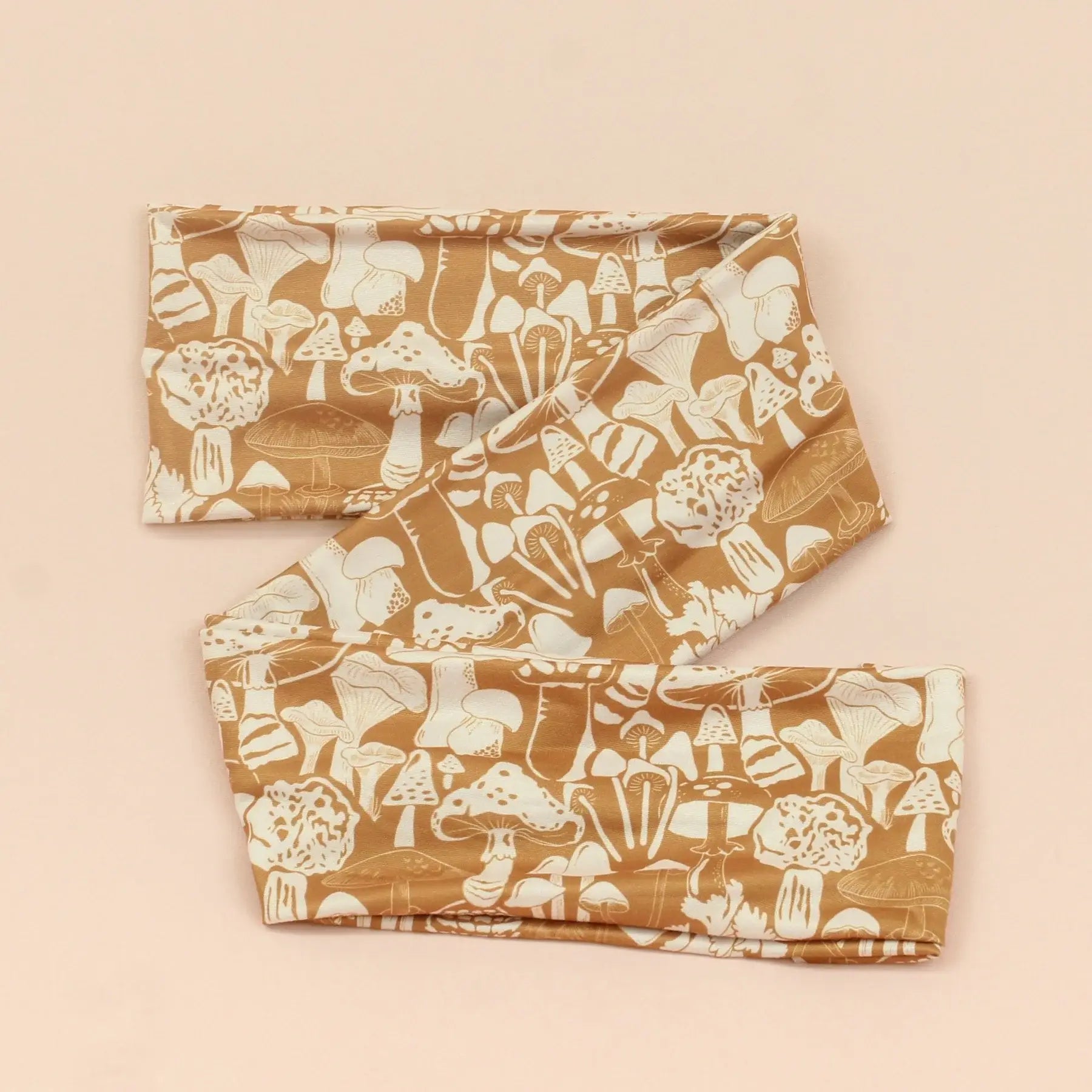 This pattern features a tan background with white mushrooms, leaves and fall elements.