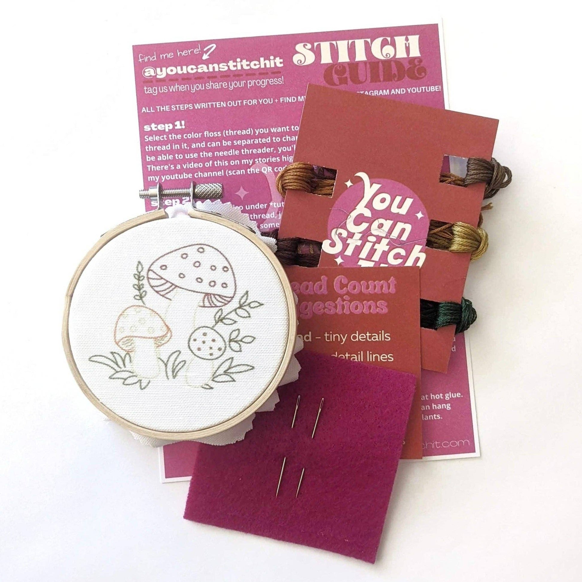 -’Mushroom’ Kit comes with a 3 inch wooden/bamboo hoop, 2 needles, pre-printed pattern, thread and thread guide!