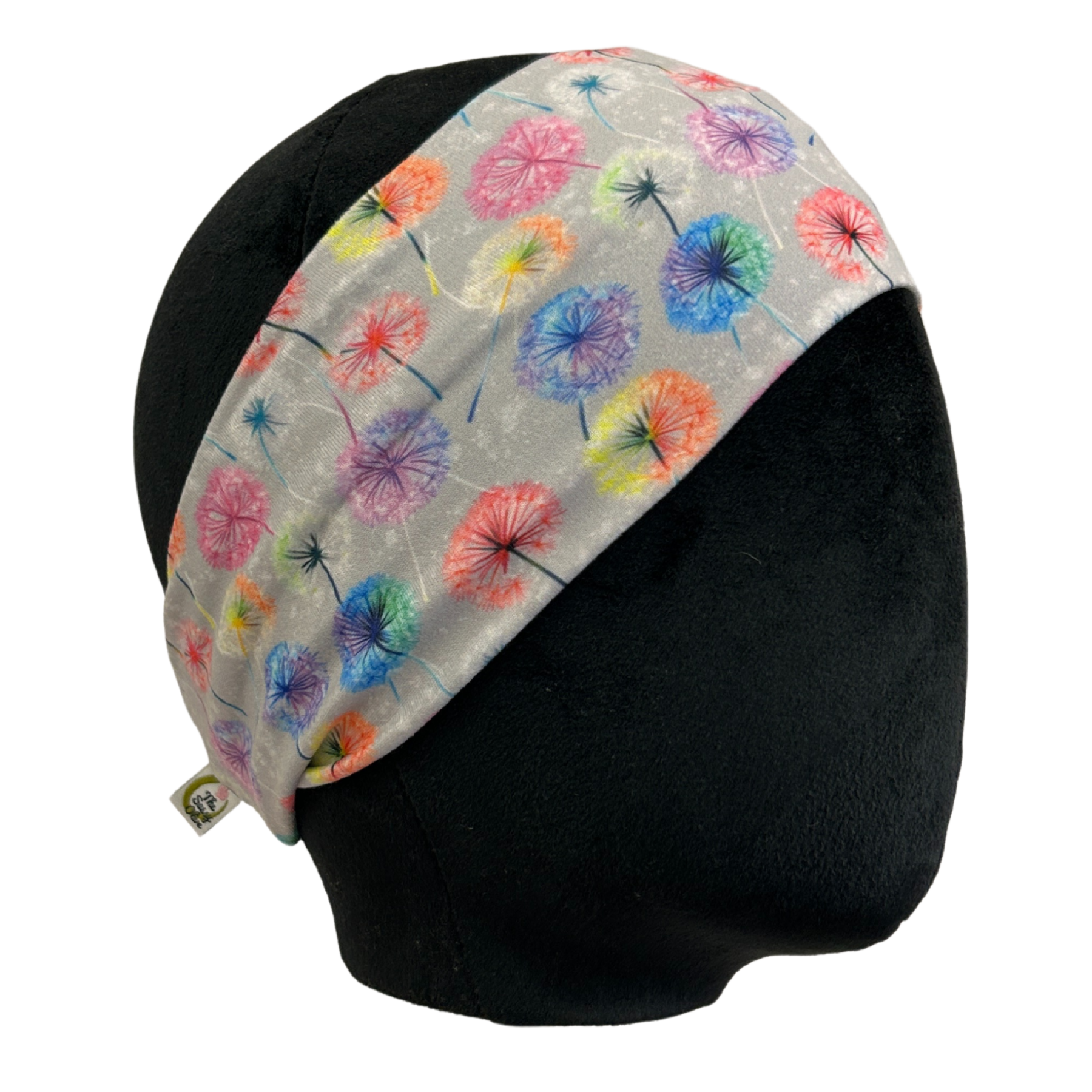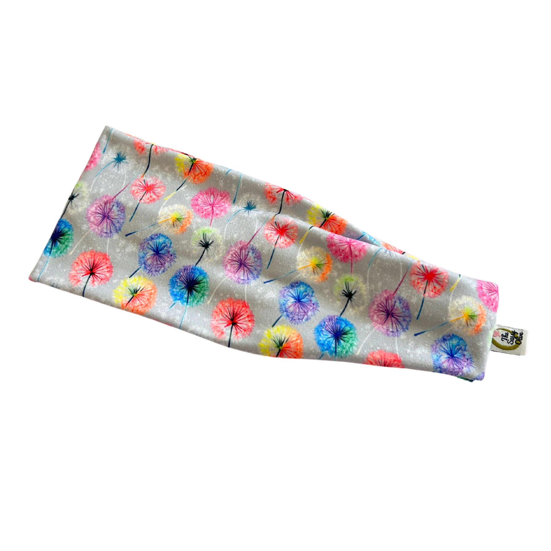Bright dandelion fluff in neon hues pops against a soft gray background for a headband that’s playful and bold.