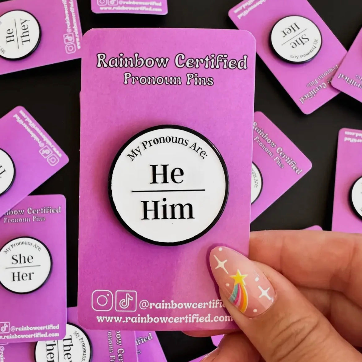 Pronoun pins with a simple design. Let your pin do the talking and proudly display your pronouns. Perfect for any outfit or backpack. Wear one with pride!