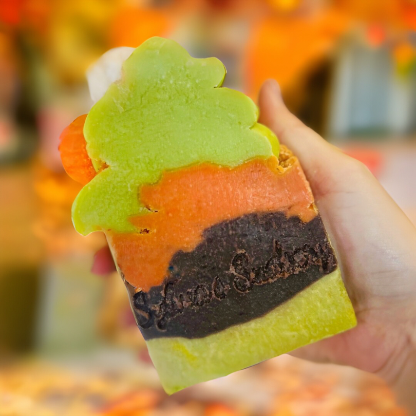 This bar is enhanced by subtle notes of mahogany wood, velvety cream, and a hint of vanilla bean, evoking the warmth and coziness of a crisp autumn night at the pumpkin patch.