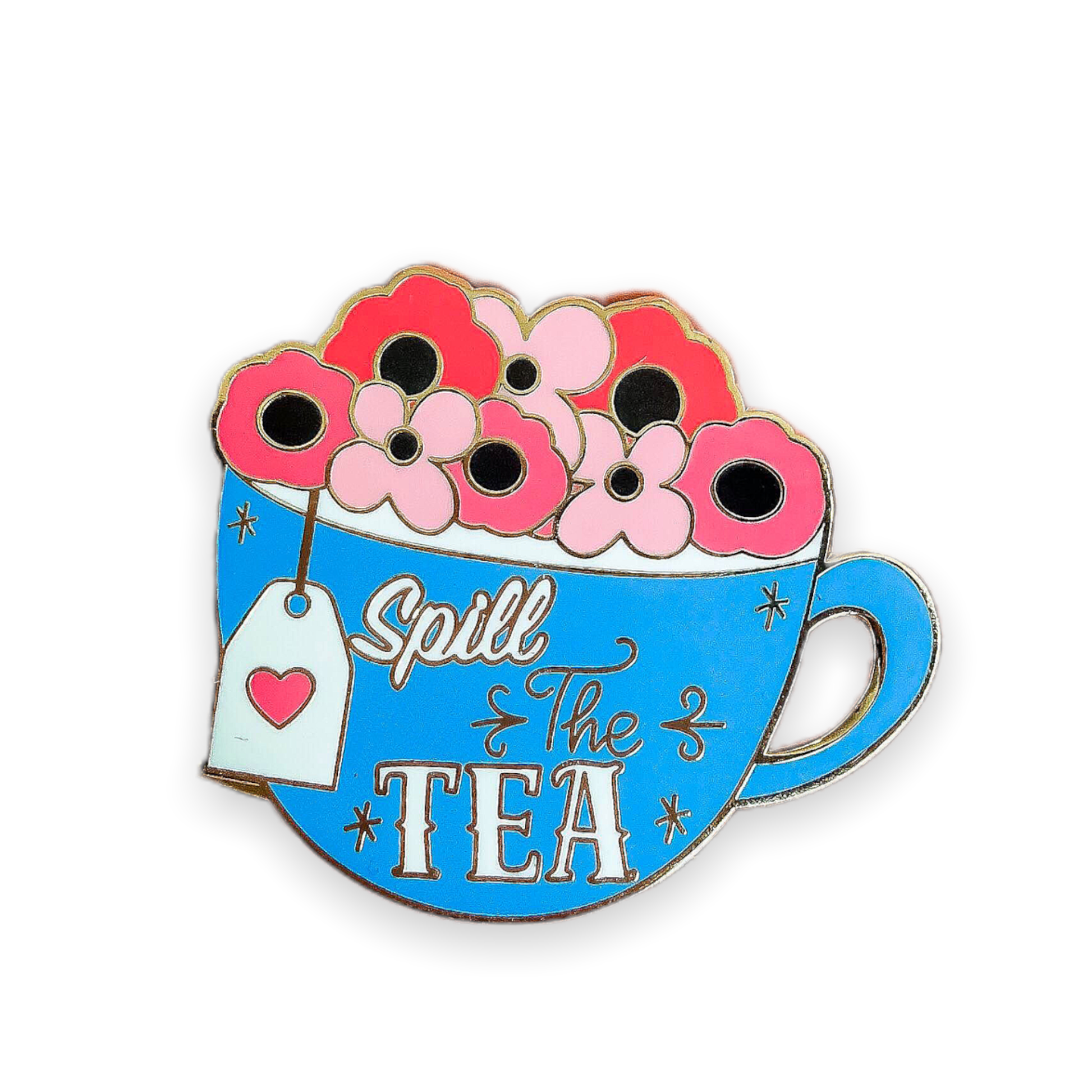 Spill the Tea enamel pin. Great for your collections or a gift for a friend. 1.75” x 1.45" hard enamel pin.